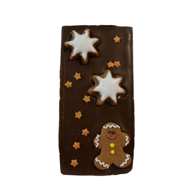 Nasza ręcznie robiona czekolada z pierniczkami, piernikowym ludzikiem i gwiazdkami to słodka celebracja świątecznego klimatu. Starannie stworzona przez doświadczonych rzemieślników, zachwyca smakiem, jakością i wyjątkowym wyglądem. Doskonała jako prezent lub słodka przyjemność dla siebie.