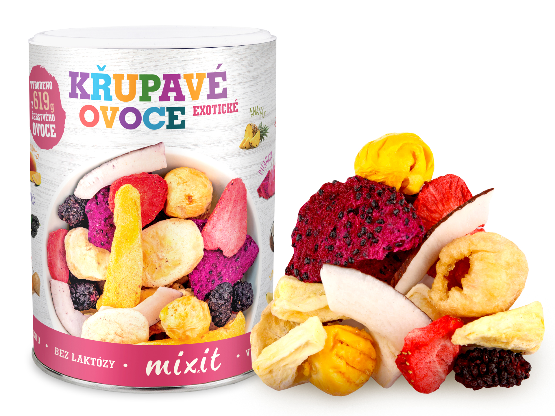 Egzotyczny mix liofilizowany Mixit to naturalna, chrupiąca przekąska powstała z owoców suszonych mrozem. Proces liofilizacji pozwala zachować witaminy, minerały, kolor i charakterystyczny kwaśno-słodki smak malin, bez dodatków cukru, konserwantów i sztucznych dodatków.