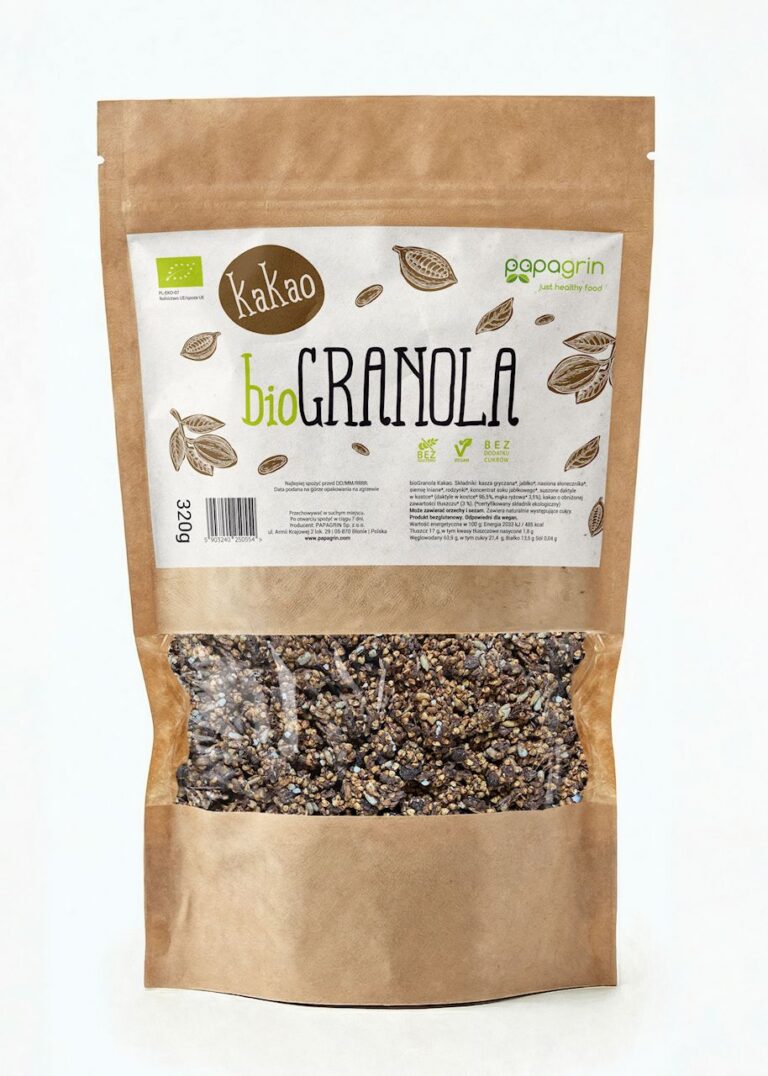 Granola Kakao Papagrin BIO to doskonała propozycja dla miłośników czekoladowych smaków w zdrowym wydaniu. Naturalna, chrupiąca i pełna wartości – idealna na każdy dzień!