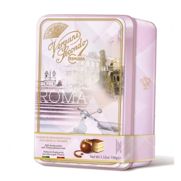 Vergani Roma Tiramisu – włoskie praliny z mlecznej czekolady z kremem tiramisu w ozdobnej puszce 100g