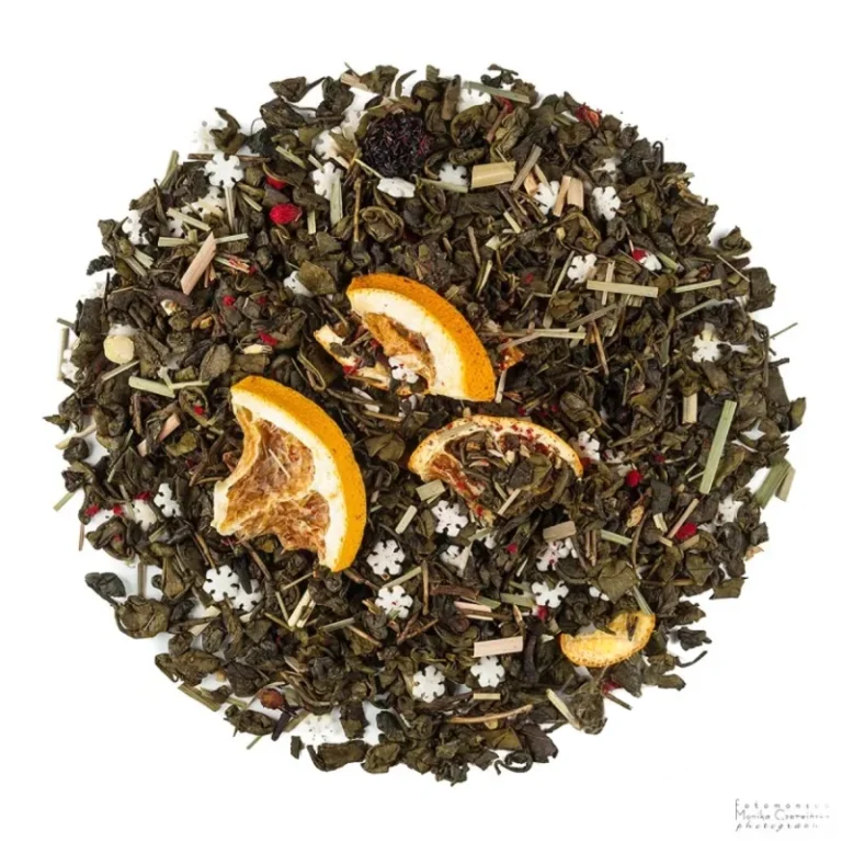 Składniki: herbata zielona Gunpowder, płatki cukrowe (cukier, mąka ryżowa, tłuszcz kakaowy, substancja zagęszczająca (tragakanta), pomarańcza, jagody inkaskie, trawa cytrynowa, goździk, kwiat granatu, imbir, aromaty